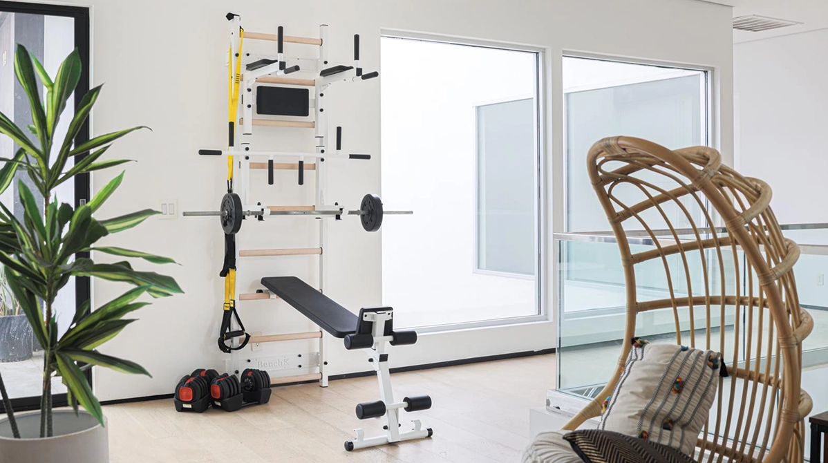 Series 7 wall bars allows doing a whole body workout without leaving home – pull-ups, dips, sit-ups, bench press or TRX training, etc. BenchK rotatable workout bench with rollers for knee support and additional seat allows performing wide range of exercises at an angle or in a horizontal position. Equally compatible with public and private spaces. Suitable for higher ceilings.