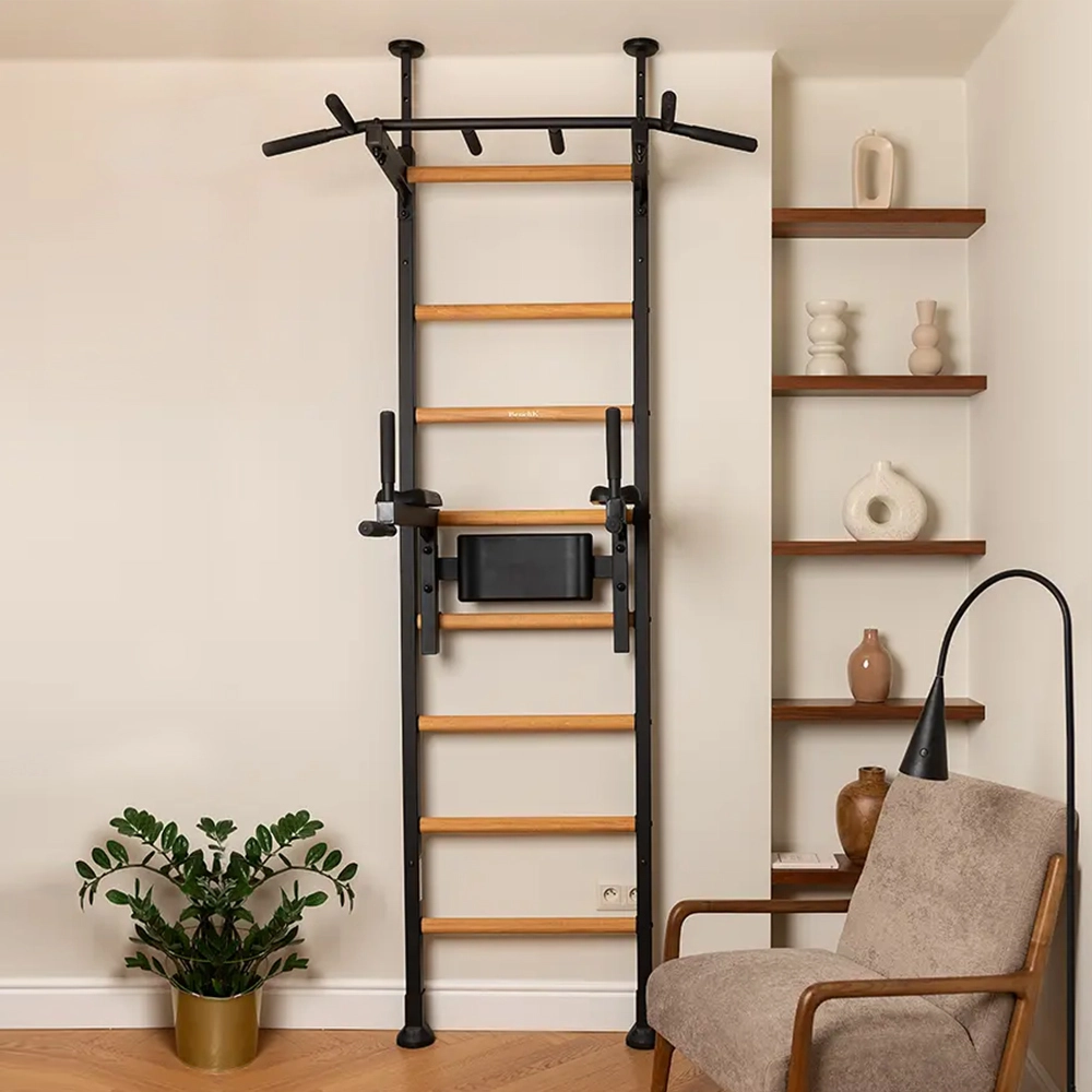 Thanks to the combination of solid beech wood and steel, series 2 wall bars are a piece sports of furniture that fits perfectly into modern interiors. Multifunctional wall bars with additional equipment will be a great home gym, occupying only 1m2 of space. The BenchK DB1 dip bar has armrests and back support made of integral polyurethane foam. Suitable for lower ceilings.