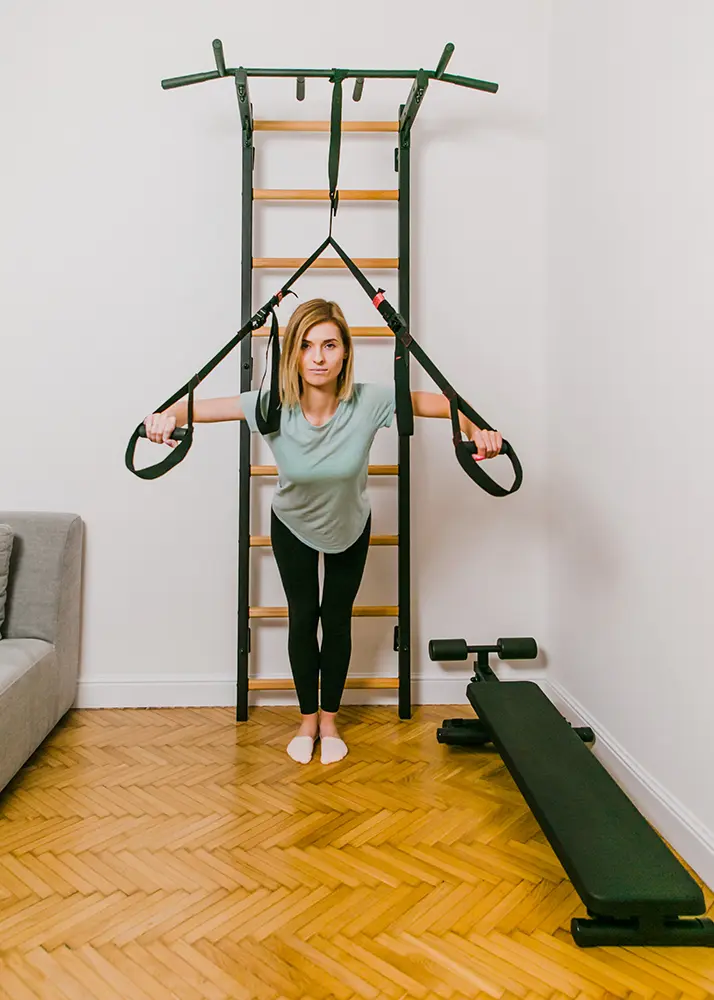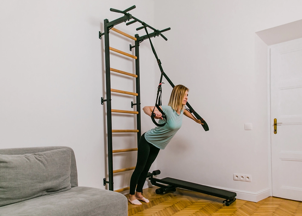 Each rung has been made of solid beech wood and  hand-oiled with two layers of organic oil produced in Germany, based on linseed oil which is approved for contact with food. The combination of natural wood and steel produces a perfect, stylish piece of sports furniture for a modern interior of a home or an office. BenchK 721 stall bar can be equipped with additional equipment such as DB1 dip bar and B1 workout bench, creating a fully-fledged home gym taking just 1 square metre/10.76 ft² of space.