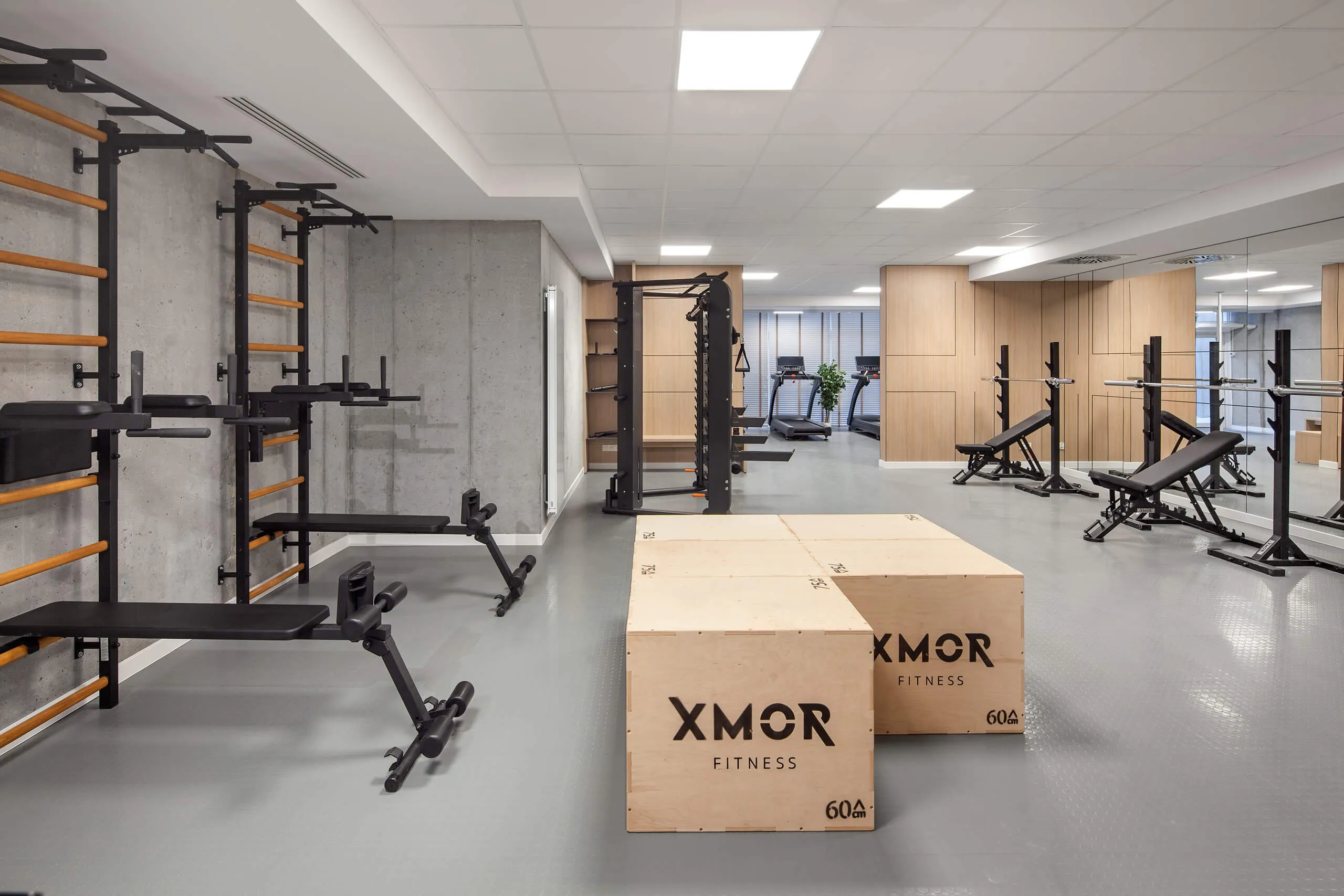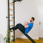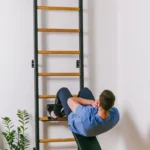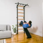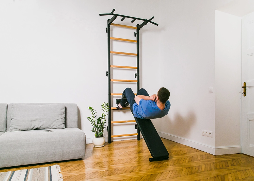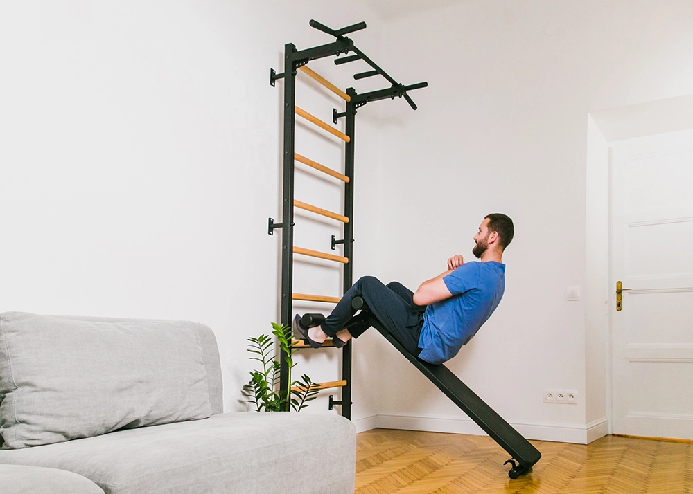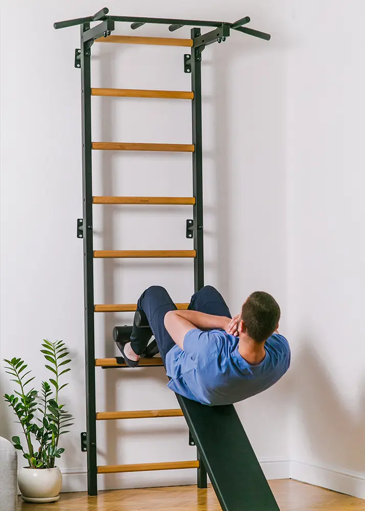 The steel profiles of the gymnastic ladder have rectangular shape 40 x 50 mm/1½″ x 2″ and are 2cm/²⁵/₃₂” thick. They have been powder coated, which adds to their durability. The precision of every detail has been achieved thanks to the use of modern technologies of laser cutting and joining. Nine beech wood rungs fit perfectly into the steel profiles. The combination of steel and natural wood gives an effect of a stylish and functional piece of sports furniture, which perfectly fits into a variety of interiors.