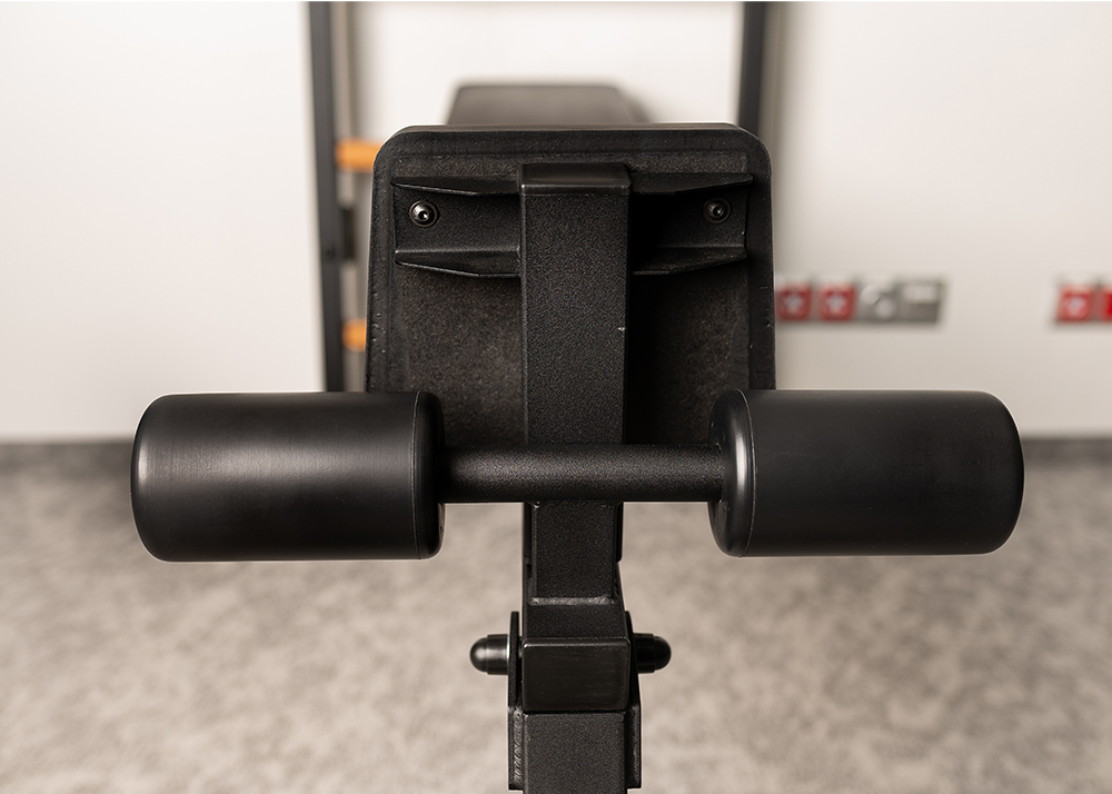 The bench BenchK B1 does not contain any element made of synthetic leather or foam. The back support (as well as the small seat and under knee support) is a uniform element made of integral polyurethane. The bench is reversible with an additional seat, which allows for various exercises such as crunches, presses with a barbell or dumbbells at an angle or in a vertical position.