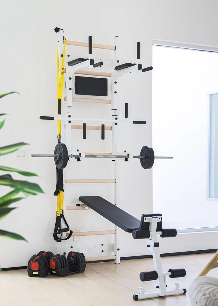 BenchK wall bars with convertible steel 6-grip pull-up bar that can also be used as a barbell holder, dip bar with back support and advanced workout bench