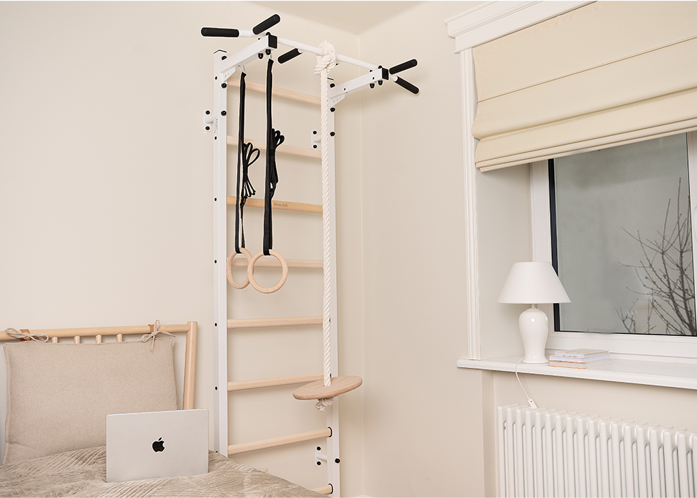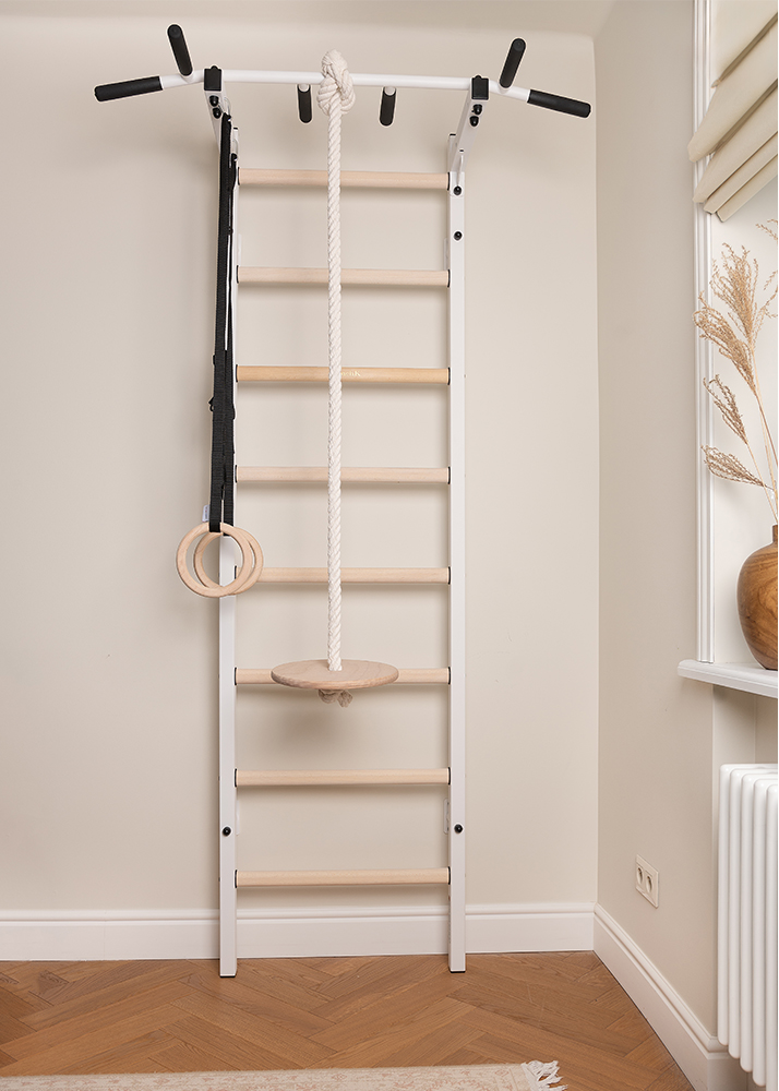 The rings are made of beech plywood and are hung on black straps. Polished to perfection, the rings are smooth and safe for the hands. The straps are equipped with a buckle that allows for quick length adjustment as well as easy removal. Any excess strap can be fastened by a velcro strip. Once the child grows, the rings can be used as a TRX strap.