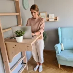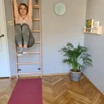 BenchK solid beech wooden wall bars with an adjustable pull-up bar and a removable BenchTop used as a desk