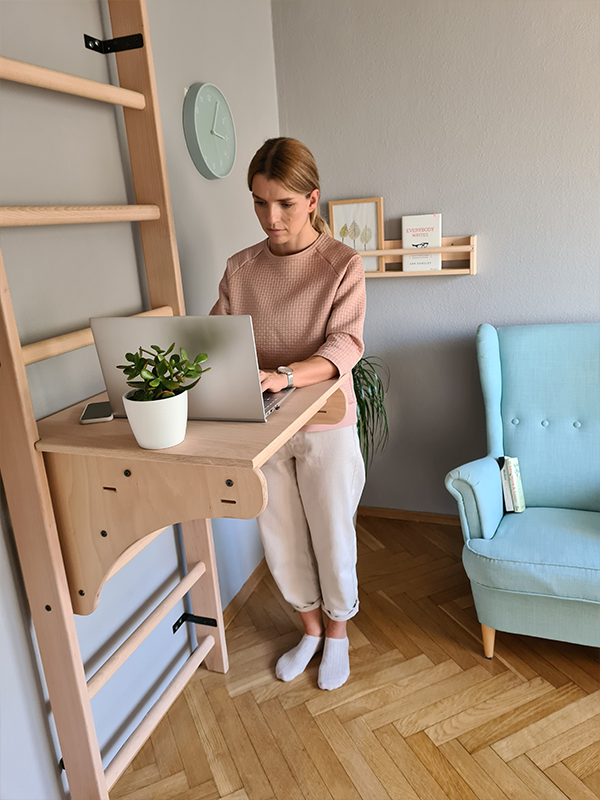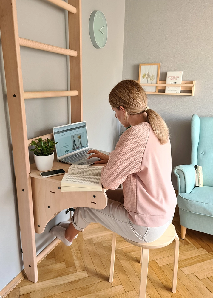 The beech stall bar BenchK 112 with desk BenchTop BT204 is a model that not only motivates the user to take up physical activity, but also serves as a desk. It can be used by every family member thanks to the fact that the height of the desk can be altered. BenchK 112 with desk is a practical and modern piece of sports furniture.