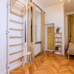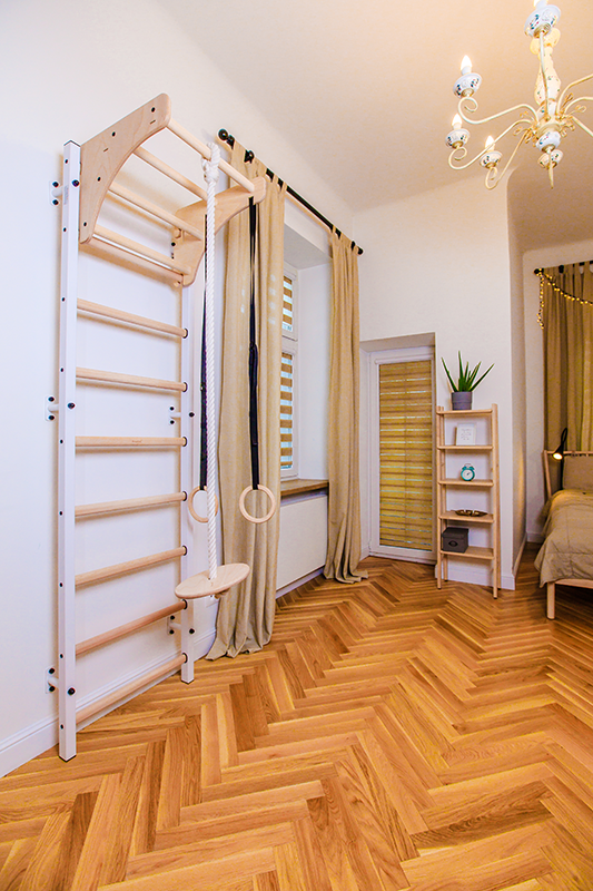BenchK 711 wall bars with wooden pull-up bar has 9 oval wooden rungs which perfectly harmonize with the solid steel profiles. The rungs, made of solid beech wood, are not varnished but are hand-oiled with two layers of organic oil produced in Germany, based on linseed oil which is approved for contact with food. For its production, we use materials of the best quality: durable and pleasant in touch beech wood and powder-coated steel. Now we can create a mini home gym that looks stylish and takes as little as 1 square metre/10.76 square feet.